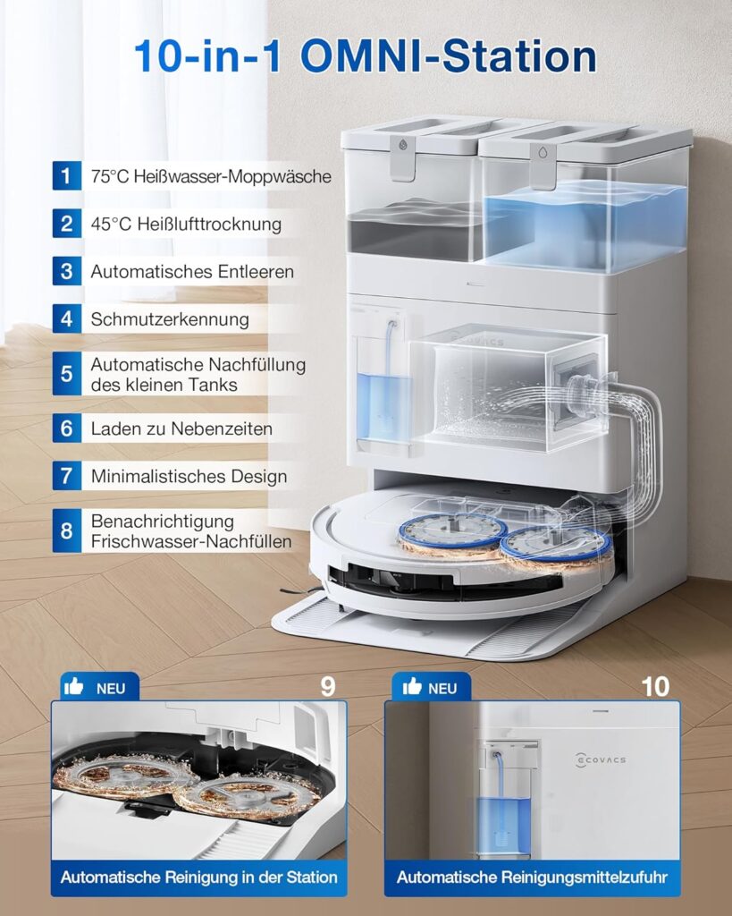 Der ECOVACS DEEBOT T50 PRO OMNI Gen2 kombiniert starke Saugkraft, intelligente Hinderniserkennung und eine fortschrittliche All-in-One-Station, um eine gründliche und automatisierte Bodenreinigung zu ermöglichen. Mit ultrastarkem 21.000 Pa Saugdruck, einer dynamisch ausfahrbaren Seitenbürste und einer innovativen Wischtechnologie erreicht der Roboter selbst schwer zugängliche Stellen und reinigt bis zu den Kanten präzise.